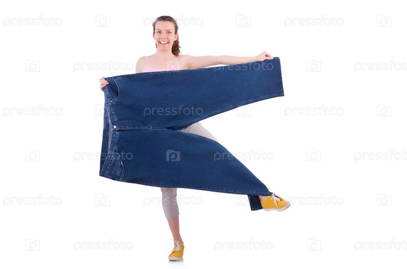 Женщина с большими джинсах в концепции диеты