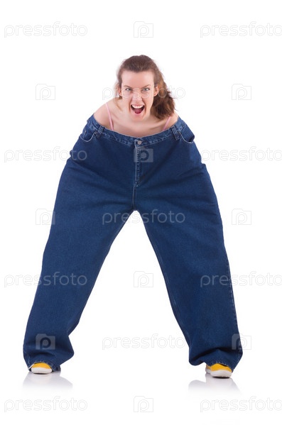 Женщина с большими джинсах в концепции диеты