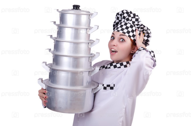 Повар со стопкой кастрюль на белом фоне
