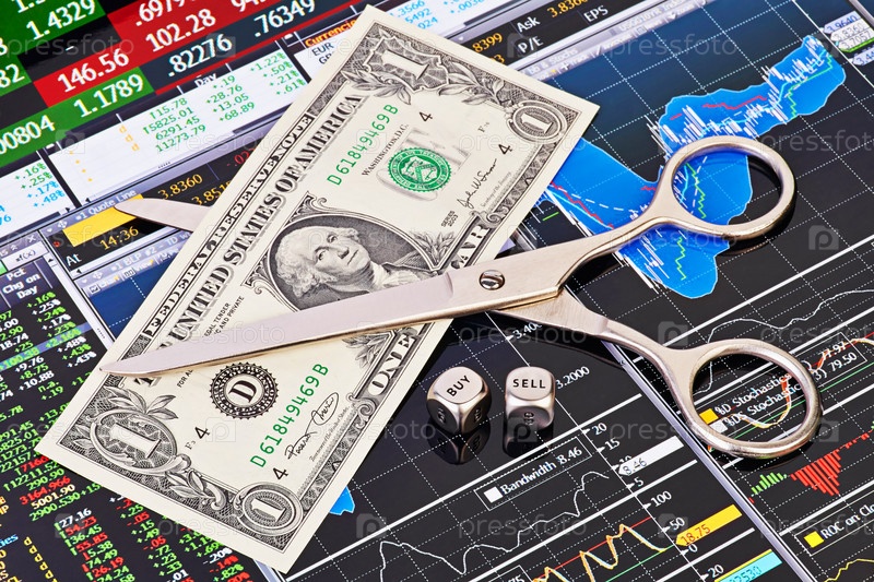 Ножницы режут доллар, наперстки со словом "продажа" и "покупка". Финансовые графики. Выборочный фокус