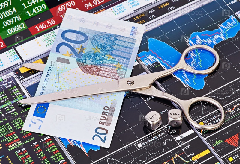 Ножницы режут евро, наперстки со словом "продажа" и "покупка". Финансовые графики. Выборочный фокус