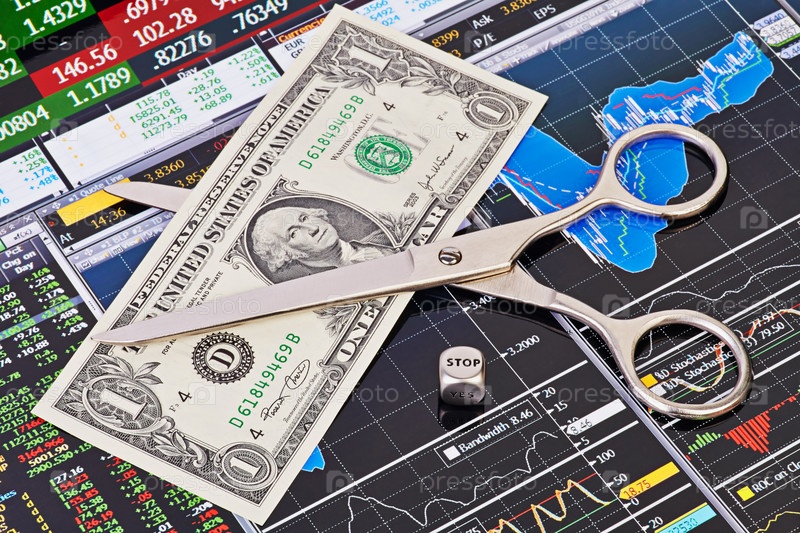 Ножницы режут доллар, наперсток со словом "стоп". Финансовые графики. Выборочный фокус