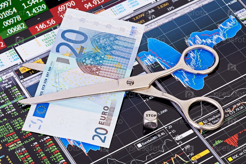 Ножницы, режущие долларовую банкноту, кость с словом СТОП, финансовые графики и диаграммы цен. Выборочный фокус