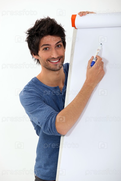 Молодой человек пишет маркером на белой доске
