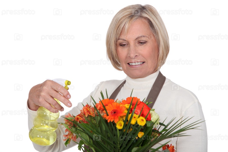Пожилая женщина-флорист распыляет воду на букет