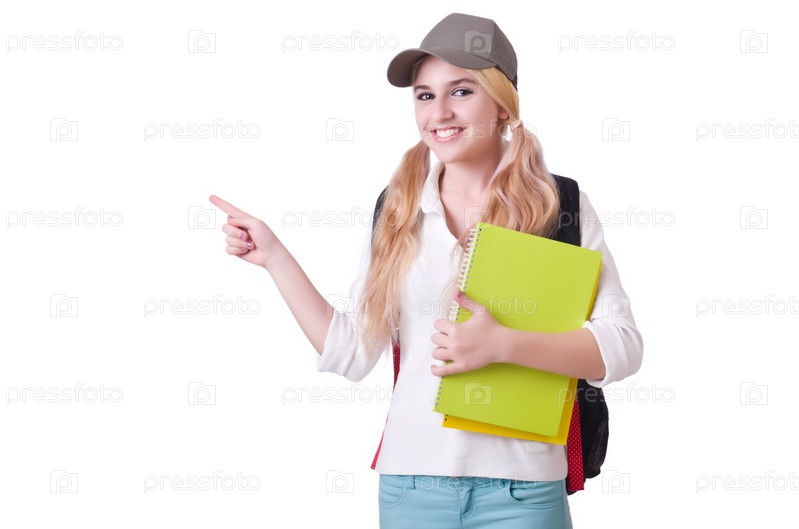 Девушка студентка с книгами на белом
