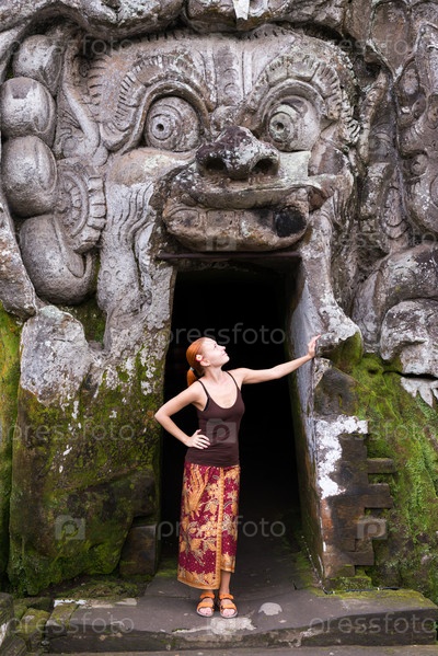 Молодая женщина стоит во рту у демона в Гоа Гаджа
