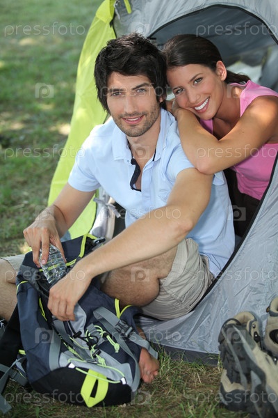 Пара сидит у палатки