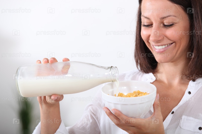 Женщина наливает молоко в тарелку каши