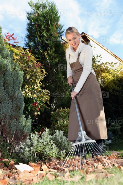 Женщина работает граблями в саду