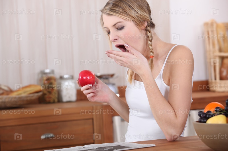Женщина зевает за завтраком