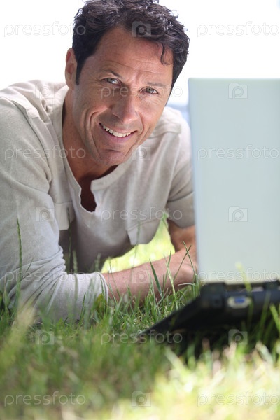 Мужчина с ноутбуком на траве