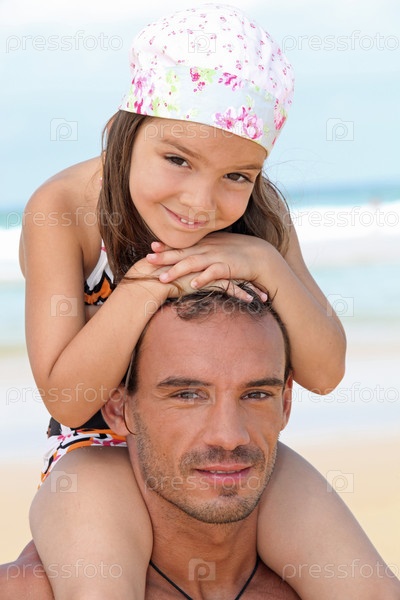 Маленькая девочка сидит на плечах отца на пляже