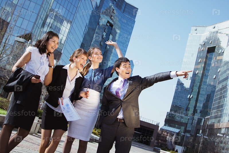 Группа руководителей на фоне бизнес-центра. На улице