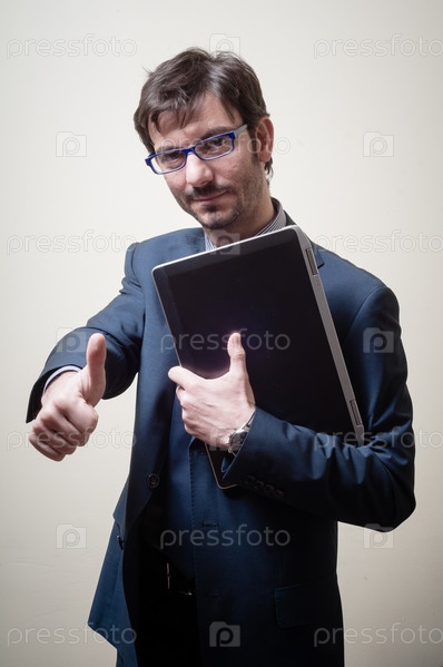 Бизнесмен с ноутбуком показывает большой палец