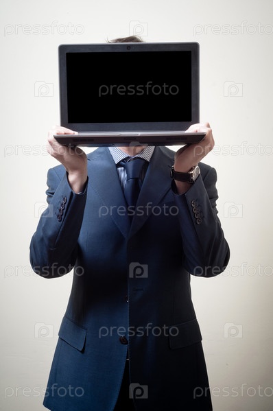 Бизнесмен с ноутбуком перед лицом