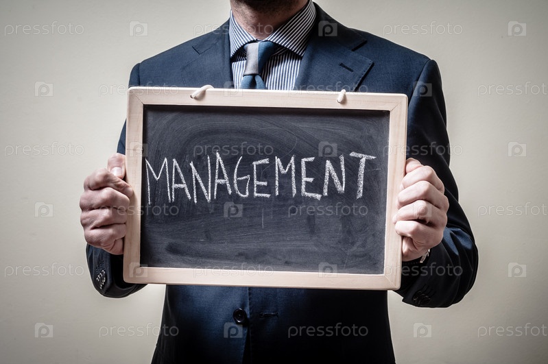 Бизнесмен держит доску со словом "менеджмент"