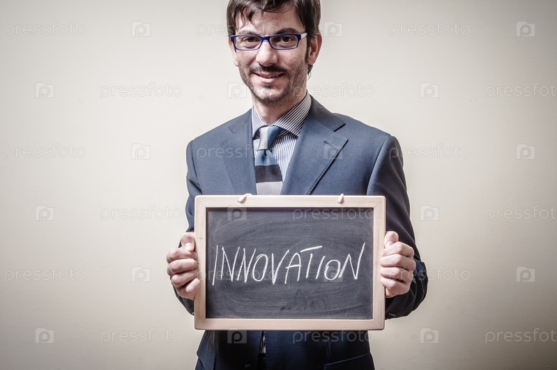 Бизнесмен держит доску со словом "инновации"
