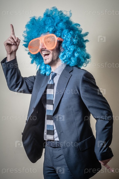 Смешной бизнесмен в больших оранжевых очках и голубом парике