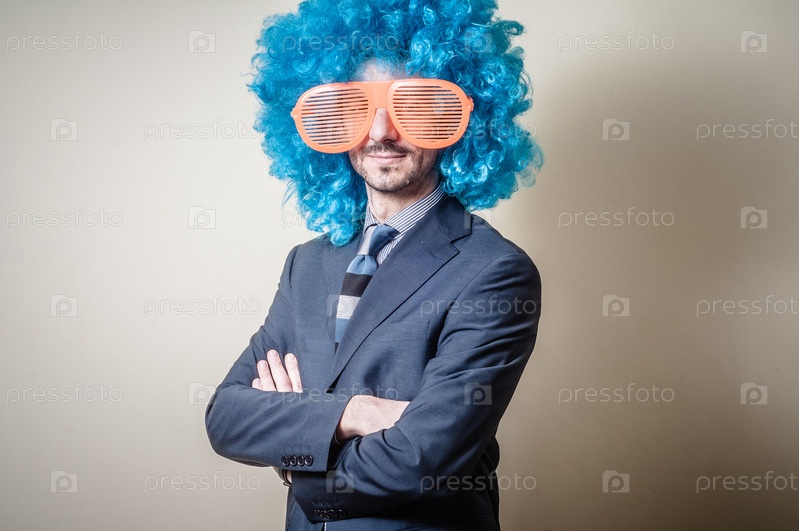 Смешной бизнесмен в больших оранжевых очках и голубом парике
