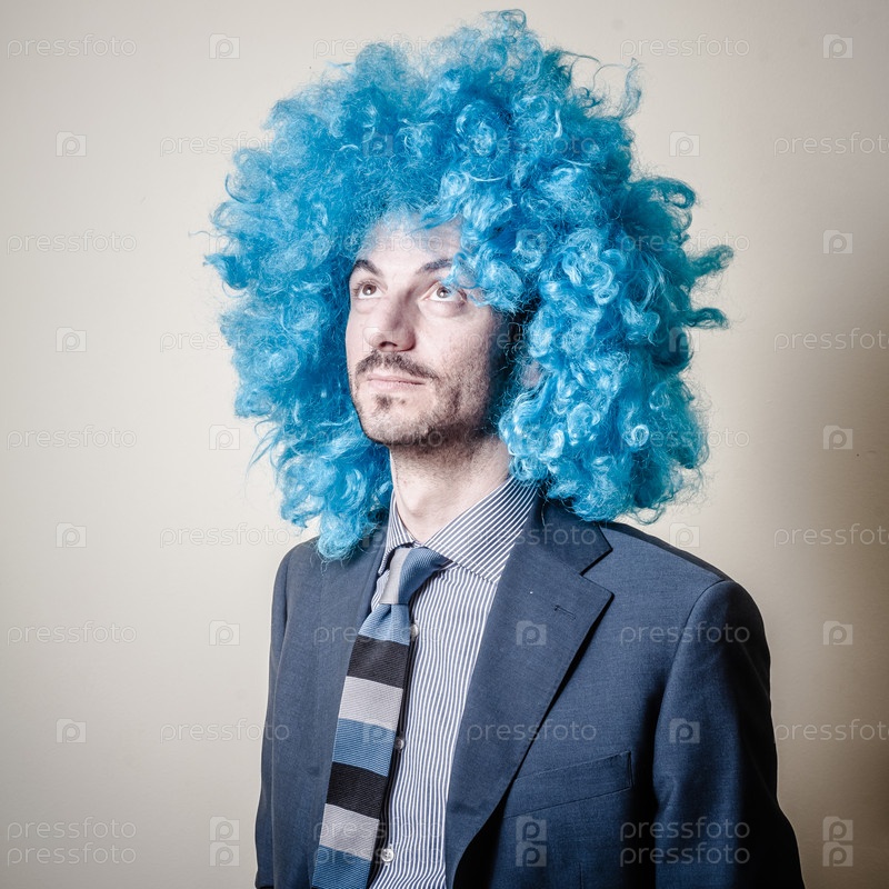 Смешной бизнесмен в голубом парике