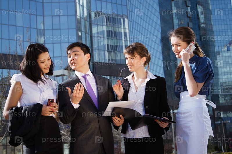Всреча деловых лудей на улице у офисного здания