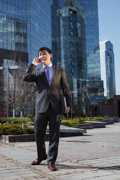 Молодой предприниматель говорит по мобильному телефону, стоя перед бизнес-центром