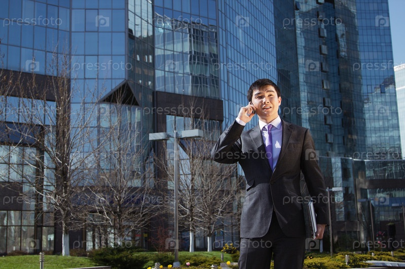 Молодой предприниматель говорит по мобильному телефону, стоя перед бизнес-центром