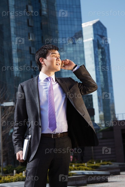 Молодой предприниматель говорит по мобильному телефону, стоя перед бизнес-центром