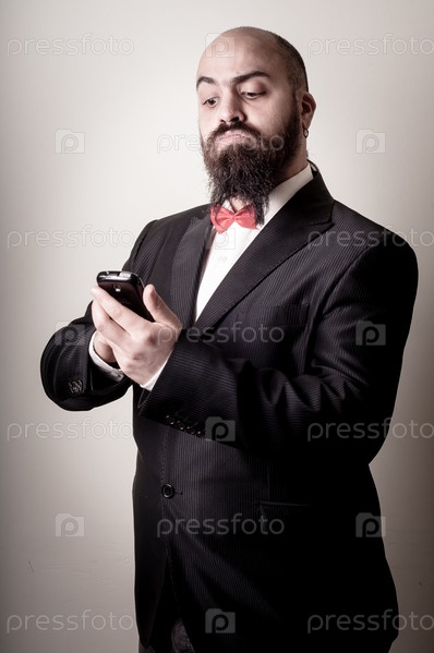 Смешной элегантный бородатый человек с телефоном