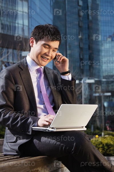 Молодой бизнесмен с ноутбуком на улице