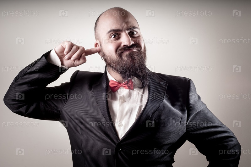 Смешной элегантный бородатый мужчина с пальцем в ухе