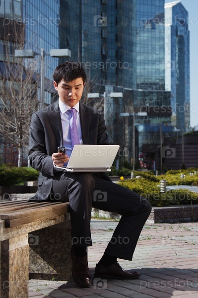 Молодой бизнесмен с ноутбуком сидит на улице