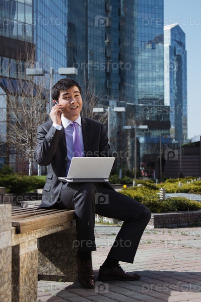 Молодой предприниматель с ноутбуком сидит на улице