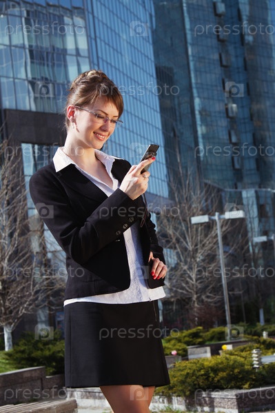 Портрет милой бизнес-леди на фоне офисного здания