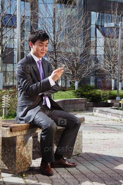Молодой предприниматель говорит по мобильному телефону, сидя перед бизнес-центром