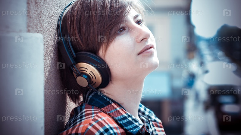Молодая женщина-хипстер слушает музыку