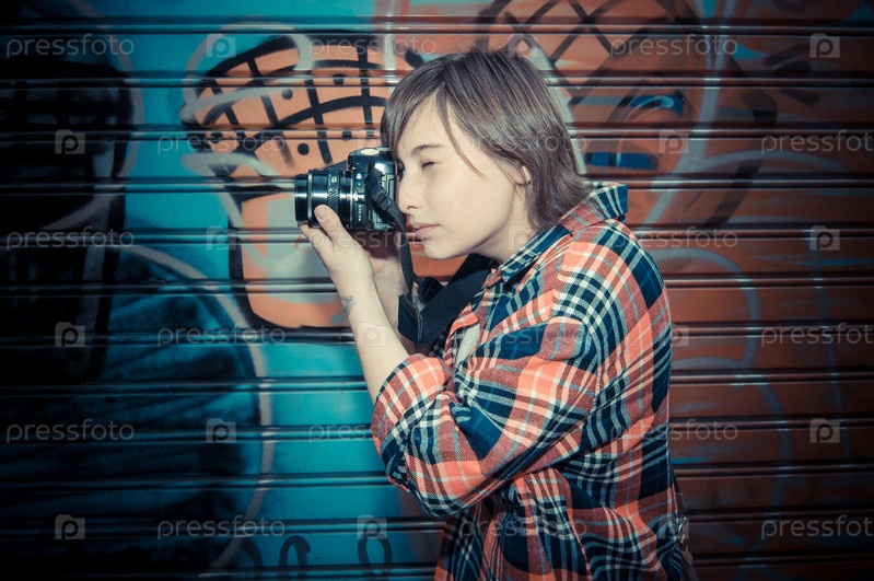 Молодая женщина хипстер фотографирует