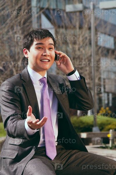 Молодой предприниматель говорит по мобильному телефону, сидя перед бизнес-центром