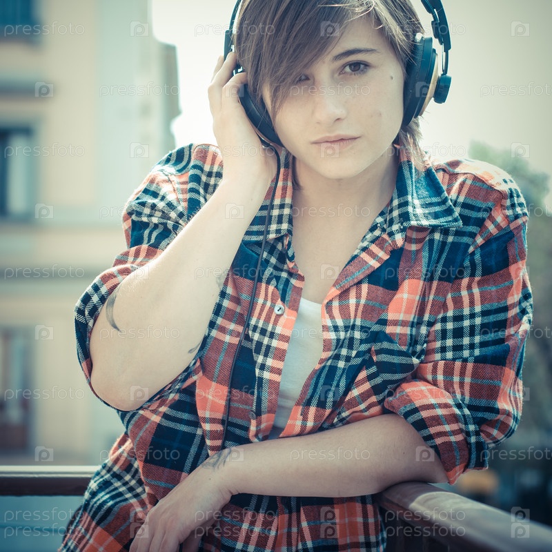 Молодая женщина хипстер слушает музыку