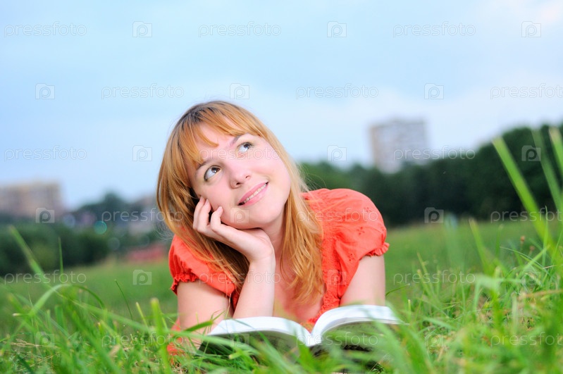 Молодая женщина мечтает в парке на траве