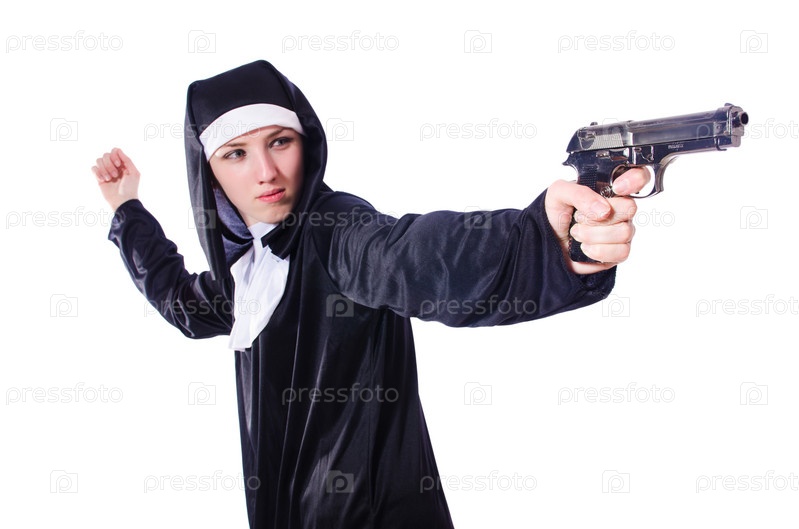 Монахиня с пистолетом, изолированная на белом фоне