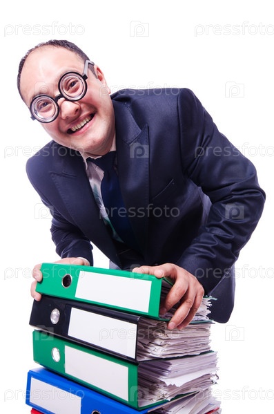 Забавный мужчина с большим количеством документов на белом фоне