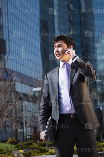 Молодой предприниматель говорит по мобильному телефону