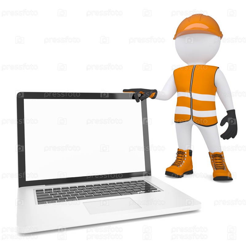 3D белый человек в спецодежде держит ноутбук