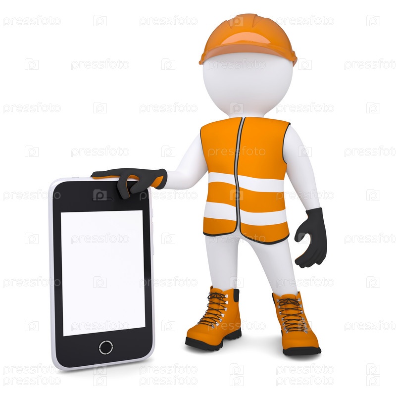 3D белый человек в специальном костюме держит смартфон