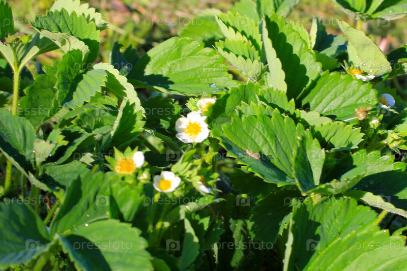 Цветущие кусты клубники в саду