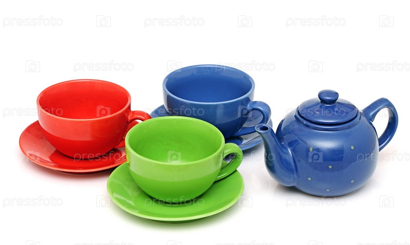 Красочные чайные чашки и заварочный чайник, изолированные на белом