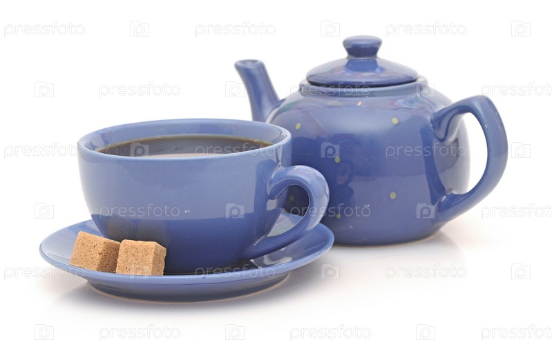 Заварочный чайник, чашки и сахар на белом фоне