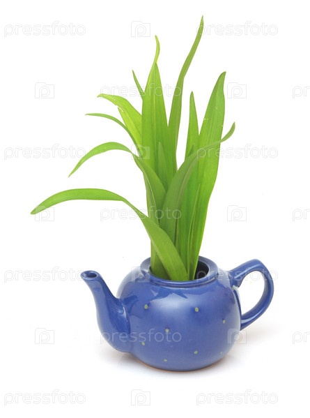 Зеленая трава в заварочном чайнике, изолированная на белом